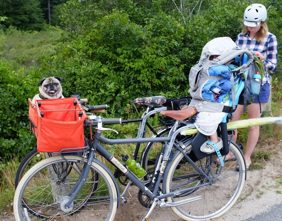 Bare essentials - sunblock, water bottle, change of clothes, swimsuit. If you have young children, make sure to figure out the napping while biking situation. Trailers are great for this and our special trick for front/rear child seats is using an Ergo baby carrier and pillow.